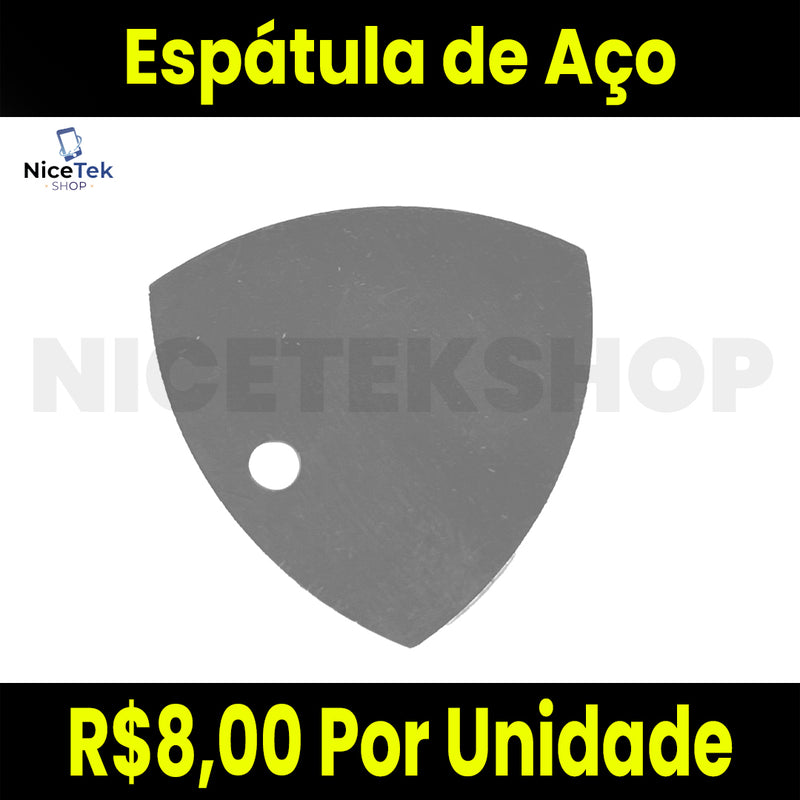 Espátula metálica de precisão fabricada em aço temperado, utilizada em manutenção eletrônica, desmontagem de celulares, tablets, notebooks e outros dispositivos. Ferramenta resistente, ideal para remoção de colas, fitas, películas e componentes colados sem danificar as superfícies.