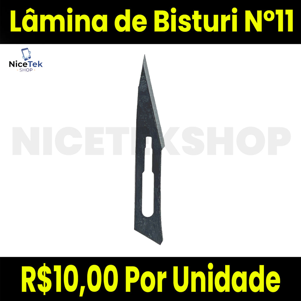 Lâmina de bisturi modelo Nº11, utilizada para cortes de precisão em trabalhos técnicos, eletrônicos e laboratoriais. Indicada para manutenção de celulares, placas de circuito, abertura de carcaças e remoção de adesivos e fitas. Fabricada em aço inoxidável de alta resistência e compatível com cabos padrão nº3.