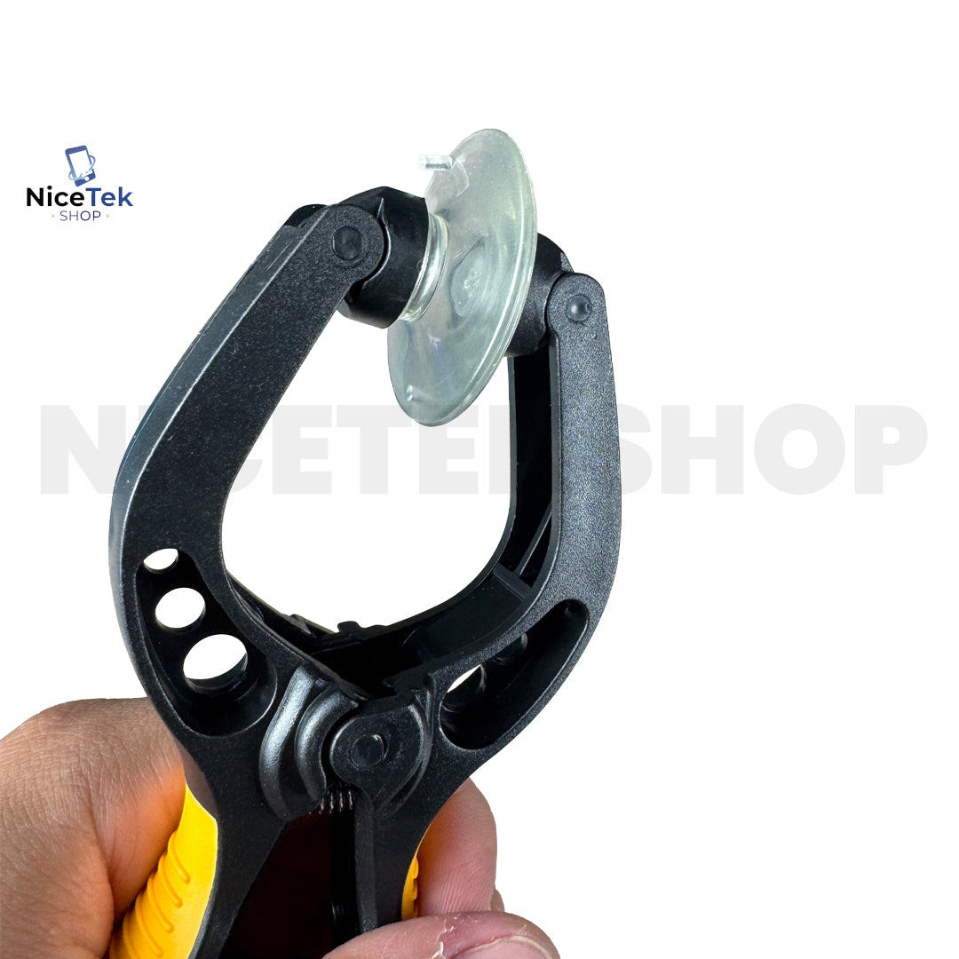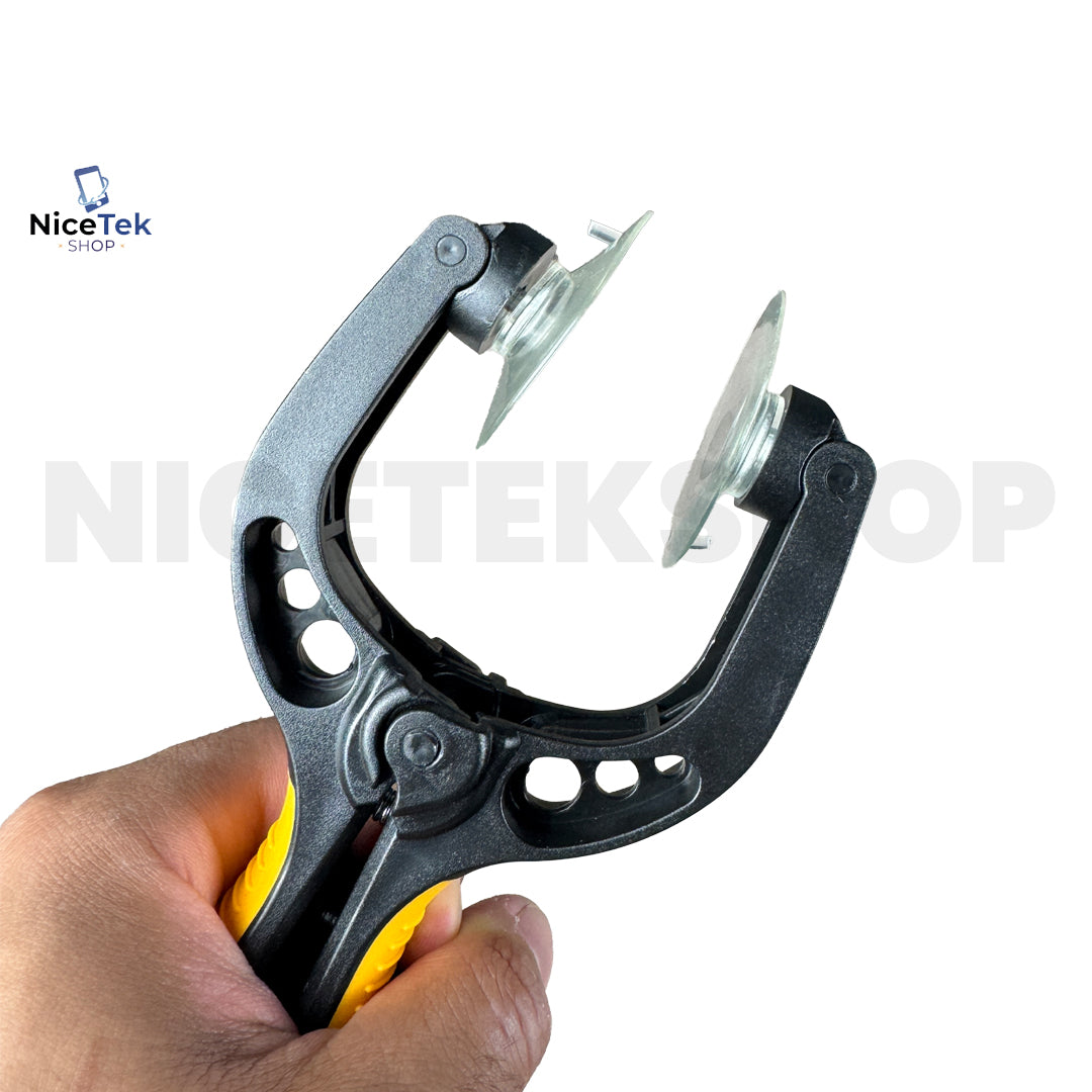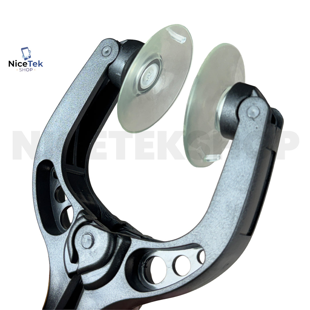 Alicate com sistema de ventosa dupla projetado para remoção segura de telas e superfícies lisas, permitindo a abertura controlada de dispositivos eletrônicos sem danificar a estrutura.
