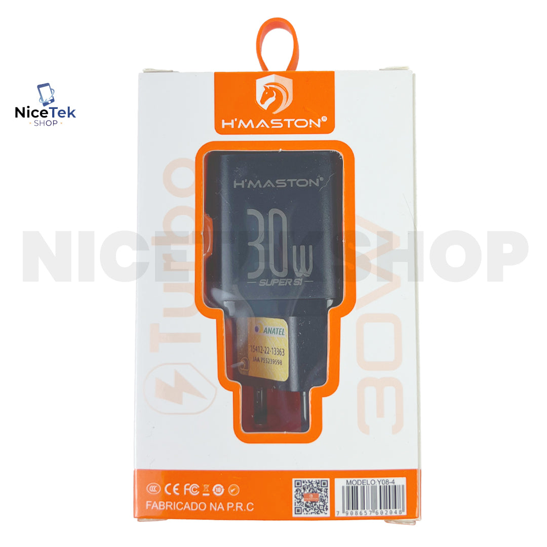 Fonte/carregador de 30 W, modelo Y08-4 da marca H’Maston, homologado pela Anatel. Desenvolvido para recarga rápida de smartphones, tablets e demais dispositivos eletrônicos através de porta USB-C (tipo C). Ideal para uso automotivo, com design compacto, eficiente e de alta durabilidade.